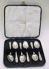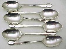 ■2001.3/9 シルバープレートのスプーン6本セットは、$19でしたが、ケースが結構ボロボロでした。それほど欲しかったわけではないのですが、安かったので落札してしまいました。ハンドミラーは、$29でした。こちらは、思っていたよりも大きくて重かったです。冷静に考えるとちょっと高い買い物だったかもしれません。今回の本命は、スプーンでした。$59とちょっとせってしまいましたが、希望通りのものが手に入って嬉しいです。1808年製ですが、1812年の年号と2つのイニシャルが刻まれていますので、結婚記念の品でしょうか? かなり大きいスプーンですが、スープを飲んだり、カレーを食べたりとと、もろに普段使いをしています。 Antique set of 6 silver plated Coffee Spoons [$19] The cased set of 6 coffee spoon are in excellent condition with slight use to the bowls.The box has one hinge detached. Made by Prestons Ltd. of Bolton, Manchester and Preston.Each spoon measures 4 1/2 inches.
