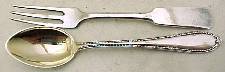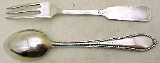 ■2001.4/6 以前から欲しかった小さいフォークですが、2本でないのが残念です。スプーンは、カットがなかなかよい味です。$20.01でした。 Antique Child's Sterling Silver Fork & Spoon [$20.01] The fork and spoon are both solid sterling silver. Each measures 4 3/4 inches with a total silver weight of .9 ounces. The fork is hallmarked as Galwn Fraget and the spoon is marked Krupp Werk #12
