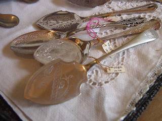 ■2001.9/15 山中湖にあるアンティークショップ「Garden Shed」で銀のジャムスプーンを\4900で購入しました。スターリングシルバーのホールマーク(片手をあげたライオン)が無かったので、国名を聞いたのですが、イギリス製とのことでした。必ずしもライオンのマークがあるとは限らないそうです。そうするとデイトレターも読めなくなるのですが、時代的にはビクトリア時代のものだそうです。購入したのは、写真の一番手前のもの。