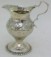 ■2001.1/23 クリーム・ジャグは約130年前の純銀製(Sterling Silver)で$113.5。デミタス・スプーンは、約40年前の純銀製で$11とかなりお得な値段で落札できました。アメリカからの送料は$17ほどで、合計$114です。 Sterling Silver Cream Jug - London 1868 [$113.5] The cream jug is solid silver with the hallmarks of maker ?S and made in London 1868. The entire jug has repousse' decoration of a House and Bird on one side and a barn and pig on the other. The cream jug measures 4 1/2 inches high and is 2 1/2 round with a silver weight of 2.6 oz. The top edge of the cream jug has 2 small split next to a repair (see photo) ![]() 2 Demitasse Silver Spoons by EV Sheffield [$11] The two spoons are in good condition and are hallmarked as made by EV in Sheffield England in 1959. They measure 4 1/2 inches with a very small bowl and a silver weight of .9 onces.