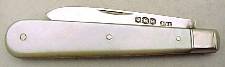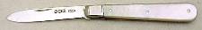 ■2001.3/27 以前から欲しかったナイフですが、白蝶貝の片面にちょっとカケがあるのが残念です。$30でした Small MOP and Silver Fruit Knife Chester 1922 [$30] The small mother of pearl and silver fruit knife is in excellent condition except of a imperfection on one side of the MOP handle as can been seen in the photo. Hallmarked as Chester 1922 and made by JYC. Knife measures 2 1/2 inches closed and 4 1/4 inches open