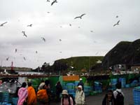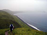 話は戻りますが、スコトン岬を起点に島の西沿いを歩いて行くのだが出発から雨。夕べ保険として買っておいたコンビニで売っているカッパがいきなり必要になるとは・・・(ToT) (実はバイク用に持ってきていたんです、カッパ。しかしバイクに乗らないから必要がないと断言し稚内にバイクと共に置いてきてしまっていたのでありました)なにしろ雨の中足元を見ながらひたすら歩いていました。途中雨があがったかなと思えば再び降り始めるし・・・各ポイントに着いても雨・あめ・アメで。しかしながら一緒に歩いているメンバー全員開き直りが早く、『せっかくなんだから途中断念しないで意地でも8時間を歩ききろう!』と。眺めのいいところになるとちょっと足を止めて一緒に眺めてみたり、リーダー(グループの責任者、この方ももちろん旅人)が歌い出し知っている歌だとみんなと一緒に歌ってみたり、メノウ浜でメノウ原石を探してみたりなどなど・・・。雨で服はビチョビチョになるは、靴はドロドロになりちょっとした下り坂になると滑って転んでみたりなどもあったけどそれがまたお互いに勇気づけあったり助け合ったりしながら8時間という長い時間なのか短い時間なのかよくわからなかったけど、すごく充実した8時間だったのではと東京に帰ってきた今でも思う。雨だったけど一緒に歩いた方々と8時間を通じて友達になれたし、参加して本当によかったと思いました。 |
