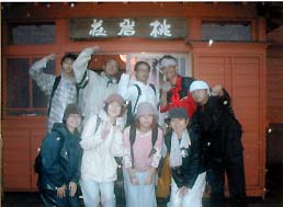| 8時間コースを終えた直後に桃岩荘の前で撮った集合写真。(’03年3月にリーダから頂きました。ありがとうございました。) |