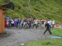 8月19日、昨日のトレッキングの疲れが少々残っていたせいか起床はさわやかなミュージック(礼文島だのにしんだのって歌っている演歌調の曲だったような気がする)で6:30(桃)に起きる。その30分後に『あたぁ〜らしぃ〜朝がきたっ!』っていう音楽とともにラジオ体操がはじまる。朝のラジオ体操っておそらく小学校の夏休み以来ではと懐かしさを感じる。しかも体操が終わるとみなさんもおそらく経験したと思うがスタンプ帳にスタンプがもらえたのである(笑)しかも桃岩荘でスタンプを10個ためると豪華賞品が贈呈されるとのこと。あたし自身10個もらうとしたらかなりの年数通わないともらえないなぁ〜っと思った矢先、『スタンプ50個目おめでとー!』という声が。ただ『すごい・・・』と思うしかなかった。