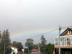 | 朝、ろくごうふらりんユースホステルの前で撮影。霧雨が降っていた中、日が差したり陰ったりしながらではあったが朝食を食べながら何度も虹を見ることができた。 |