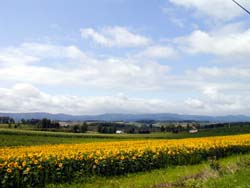 今回の北海道、異常の寒さではあったのですが、美瑛ではきっとお客様に喜んでいただこうと寒さにも負けずいろいろ花の栽培などが進んでいました。拓真館に到着したとき、建物の隣にひまわりがど・どぉ〜っと真っ黄色に咲いているではありませんか。ひまわりで有名な『名寄』も通っただけでひまわり畑を見てくることができなかったので、その分美瑛で楽しむことができました。ただ思ったのはひまわりって暑い時にしか咲かないのかと思っていたのですが、ここのひまわりは特別なんでしょうか?とちょっと不思議も感じましたけどね(笑)
