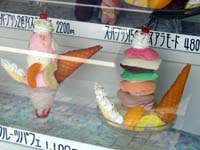 各バイク雑誌主催でやっているミーティングに参加してみたいなぁ〜っと思っていたところに、ツーリングGO!GO!主催のミーティングが静岡県の相良であるとの情報を目にし、『ZR-7Sの慣らしも終わっていないことだし、ひとっ走りしてくっかなぁ〜』てな勢いで出掛けてきました。 静岡インターで東名高速を降りて相良に向けて走っている途中、焼津にあるカントリーロードを探しに。カントリーロードとは焼津にある喫茶店で、ちょービッグなパフェを出しているお店ということで有名らしく、いずれは行ってみようかなと思っていたお店のひとつ。さすがにこの日は挑戦意欲はなかったので本当に下見がてらに行っただけでしたが、ショーケースに飾られる見本もすごい迫力でした。 |