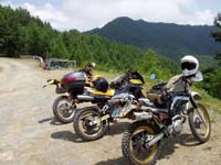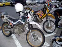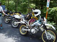 エキサイトサークルの『関東限定・林道ツーリング』というのがありまして今回はそのメンバーと初の顔合わせ&ツーリングに行ってきました。あたし自身セローに出会いかれこれ約9年、オンツーリングはかなりの回数をこなしているのですが、オフツーリングは行ったことがなかったというのが本音。たまたま身近にオフをやる人間がいなかったのでオンばかり走っていたというのもあったが、今年4月末にオンを新たに購入、それを機に本格的にオフデビューを果たそうと思い始めたところへこのサークルを知り入会したのでありました。 サークルそのものがまだできたてのホヤホヤで、趣旨のひとつに『初心者をメインとした』というところにひかれたかなぁ〜そうじゃなかったらきっと入っていなかったと思いましたね。 さてさて当日ですが、中央道・石川PAで待ち合わせをしオーナーのまるりんさんとjinnanさんと初対面。早速第一の目的地である泉水谷・横手山林道に向けて出発をする。 林道の入口で休憩し、落ち着いたところでオーナーのまるりんさんより先頭を走ってみなさいとの指令が。ほとんどというかまったく林道を走ったことがなかったのでかなりの足手まといになるかと心配ではあったが、逆に何かあればすぐに助けてくれるだろうという気落ちでおっかなびっくり走ってみることに。林道に詳しいHPでは、この泉水谷・横手山林道って中級者向けになっているだけあってちょっと走りにくい。カーブや大きなガラのあるところなんかスピードをかなり落としてじゃないと走れないという感じではあったが、さすがに初心者向けのトレッキングマシーン・セローはかなりあやつるのが楽だったのでこれが唯一の救いかなと思うのであった。 |