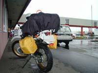 苫小牧港に上陸して撮った写真。スタートと同時に荷物に雨用カバーをかぶしての出発でした。 |