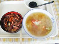 生サンマ丼としょっつる汁。生サンマはちょこっと骨が多かったが美味しくいただけることができた。 |