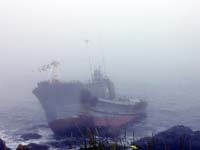 そう考えているうちに灯台の入り口に到着する。昨日の霧多布岬もそうであったが、納沙布岬も霧がすごく遠くまで見渡すことができなかった。そうわかっていながらもとりあえずは先端近くまで行ってみる。すると先端の目の前には船が打ち上がっているではありませんか!9年前に来たときはなかったし、船の老朽具合からしてここ数年前に打ち上げられたようで、しかも周囲は霧ということもあってちょっぴり気持ち悪いといった感じでした。
