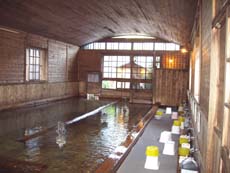 その金谷旅館の売りの浴室『千人風呂』。地元の小学生が水中メガネ持参で泳げるくらい広かったんです。 |