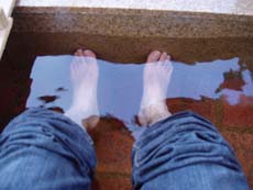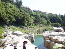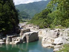こうして写真で見てみると岩石の上まで行くのにけっこう簡単かなと見えますが、正直なところ道らしい道がなかったのでちょっと苦労したんですよこれがまた。 っで今度は来た道を戻らなくてはならないのですが、突然『ドシャドシャ〜!!』っと崖崩れのような音が。もしかしてちょっと崩れちゃったの?っとちょっと気分はブルー。たったか撤収せねばとせっせと駐車場に戻ることに。 そして途中のめぼしい看板に吸い込まれる?ことなくやっと木曽福島入りすることに。 とりあえずバイクのまたがり走ってみる。古きらしき建物はみつからなかったものの、通り沿いに足湯を発見したため浸かり、足湯の真下に川が流れていたのでプラプラとすることに。 |