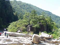 妻籠を横目に県道7号から国道19号に入り、木曽福島に向けてバイクを走らる。 はたまた走っている途中、『寝覚の床』という看板が目に入りやはり立ち寄ってみることに。 バイクがいっぱい止まっている無料のドライブインに止め、そこから急な階段や小道を下って行く。途中この道を登っていくのかと思うと、見学せず引っ返してしまおうかなとも思いきや、せっかくだしということで頑張って歩いてみる。 そこで目にしたのは大きな四角い岩石にエメラルドグリーンの川とでもいうのでしょうか、なかなかの景色でありまして、四角い岩石の上に登れるようだったので、さらに奥地へと進んでみることに。 |